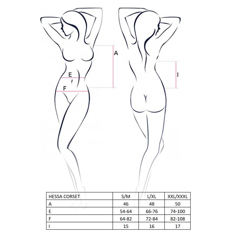 This black corset is perfect to leave your partner with his mouth open. It is black with a variety of the most sensual patterns. The central part has a fine grid with a pattern of flowers that intermingles with holes and strips that hug and caress you. This mixed with a matte black and matching panties, will make this corset the delight of anyone.